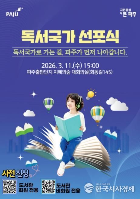 한국시사경제 문화팀 | 파주시는 오는 11일 15시, 파주출판도시 지혜의숲 대회의실에서 ‘파주시 독서국가 선포식’을 개최하고 책 읽는 도시를 넘어 ‘독서국가’로 나아가기 위한 힘찬 출발을 알린다.