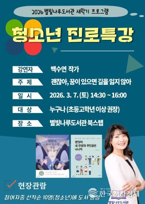 한국시사경제 권충언 기자 | 2026년 새학기 독서문화진흥 프로그램 ‘백수연 작가의 진로 특강’이 3월 7일 토요일 별빛나루 도서관 계단형 열람석(북스텝)에서 현장 강연으로 진행된다.