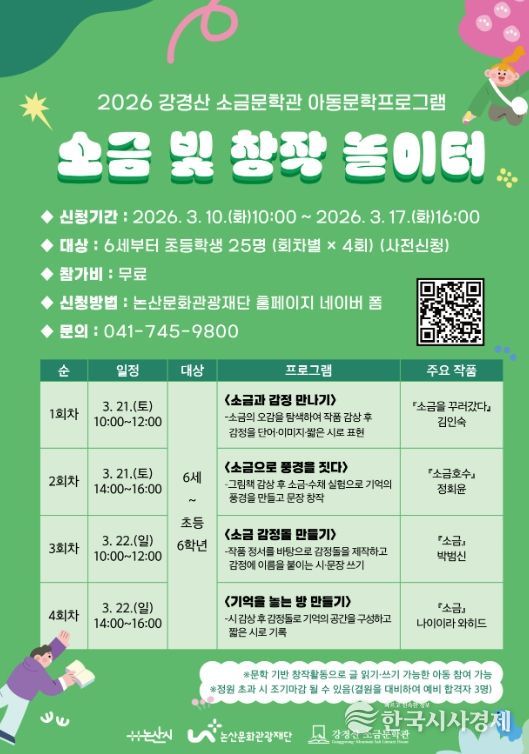 한국시사경제 김태훈 기자 | 논산문화관광재단은 지역 어린이들의 상상력과 문학적 감수성을 키우는 아동문학 프로그램 “소금 빛 창작 놀이터”를 강경산소금문학관에서 3월 21일부터 22일까지 총 4회차로 운영한다.