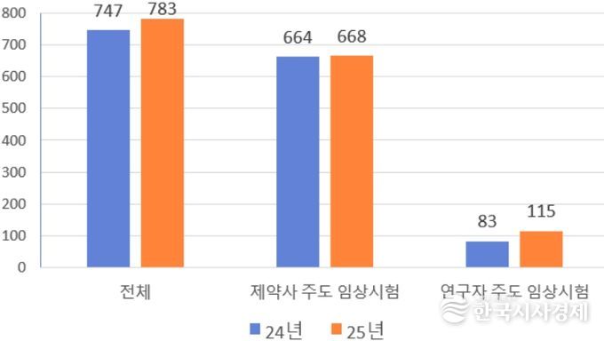 이 중 제약사 주도 임상시험은 668건(85.3%), 연구자 임상시험이 115건(14.7%)으로 확인됐으며, 연구자 임상시험은 전년 대비 38.6% 증가했다.