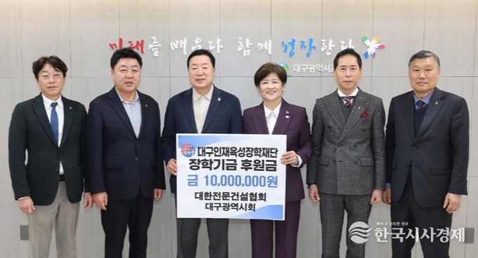 한국시사경제 대구취재본부 | 대구시교육청은 3월 5일 대한전문건설협회 대구광역시회가 장학금 1천만원을 대구인재육성장학재단에 기탁했다고 밝혔다.