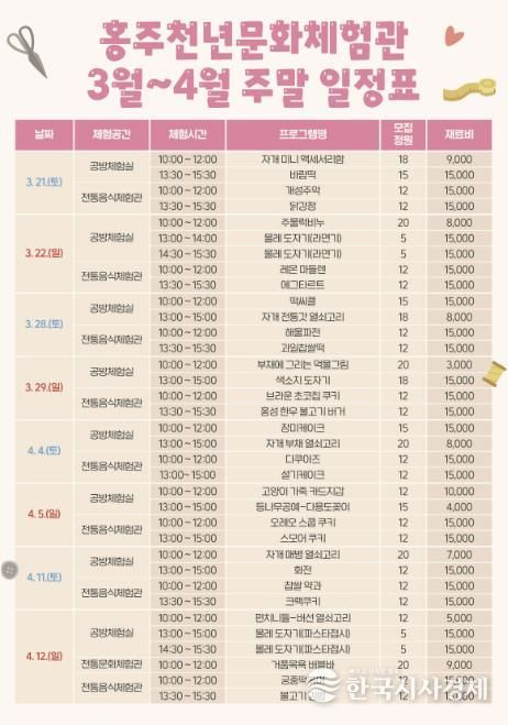 신청은 3월 12일부터 4월 15일까지 홍주천년문화체험관 홈페이지▶프로그램 신청에서 선착순으로 진행되며, 체험비는 무료이나 프로그램 운영에 따른 재료비는 참가자가 부담하여야 한다.