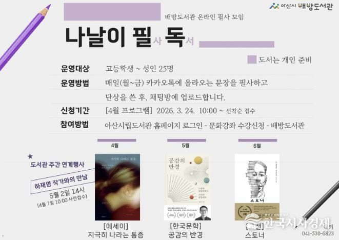 한국시사경제 충남취재본부 | 아산시 배방도서관이 작년에 이어 올해 상반기에도 고등학생과 성인을 대상으로 온라인 필사 프로그램 ‘나날이 필독’을 운영한다.