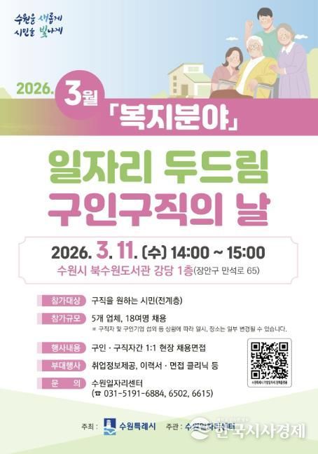 한국시사경제 사회팀 | 수원특례시는 3월 11일 오후 2시부터 3시까지 북수원도서관 강당에서 ‘3월 일자리 두드림 구인·구직의 날’을 개최한다.