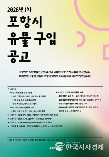 한국시사경제 노승선 기자 | 포항시는 시립박물관 건립을 위한 전시 자원 확보를 위해 오는 16일부터 20일까지 ‘2026년 1차 포항시 유물 구입’을 진행한다고 밝혔다.