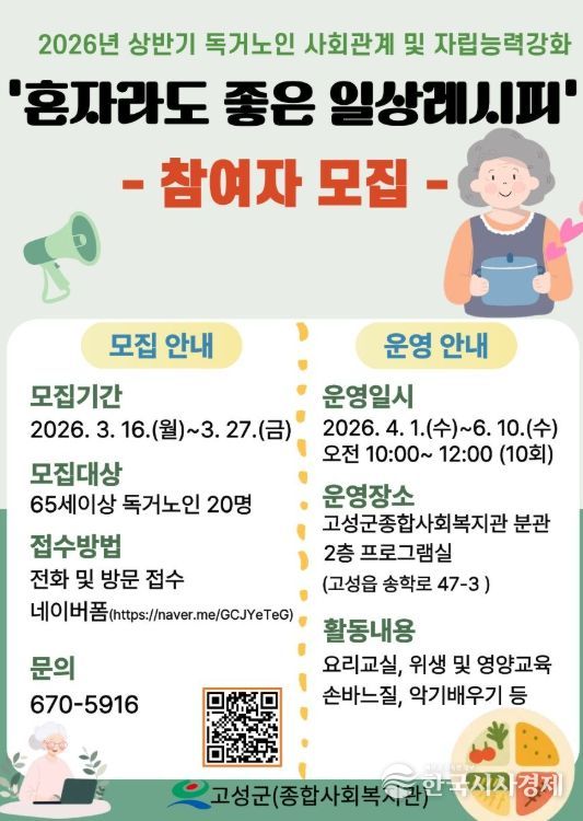 한국시사경제 문화팀 | 고성군이 운영하는 고성군종합사회복지관은 오는 3월 16일부터 관내 65세이상 독거노인을 대상으로 2026년 상반기 독거노인 사회관계 및 자립능력강화 프로그램'혼자라도 좋은 일상레시피' 참여자 20명을 모집한다.