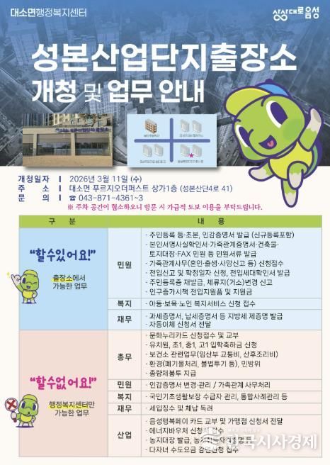 아울러 군은 향후 성본산단 인구 증가와 행정 수요 확대에 대비해 신축 출장소 건립도 중장기적으로 추진할 계획이다.