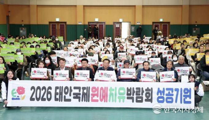 한국시사경제 충남취재본부 | 태안군이 범군민지원협의회와 함께 ‘2026년 태안국제원예치유박람회’의 성공적인 개최를 위해 지역 주민들의 자발적인 참여를 이끌어내는 대규모 범군민 다짐대회를 개최하며 민관 협력 기반의 강력한 흥행몰이에 나선다.