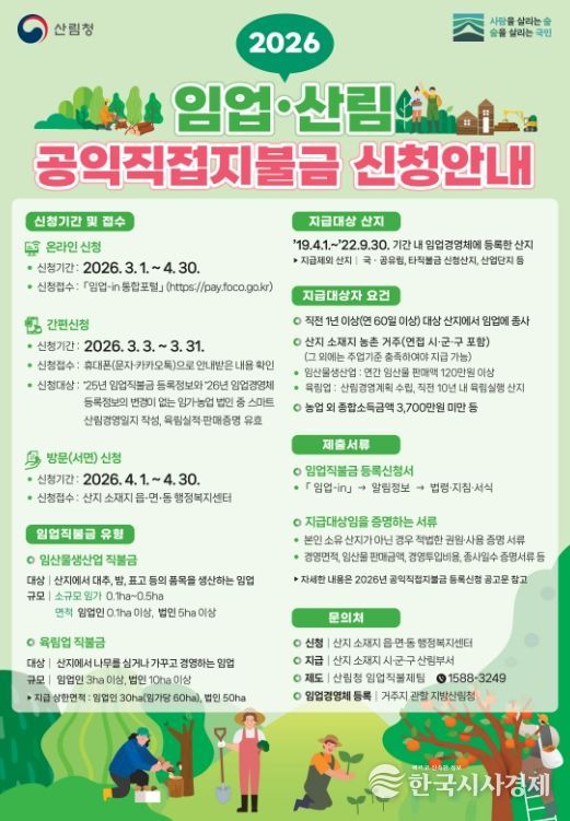 신청은 오는 4월 30일까지 ‘임업-in 통합포털또는 산지 소재지 읍면 행정복지센터에 방문해 신청할 수 있다.