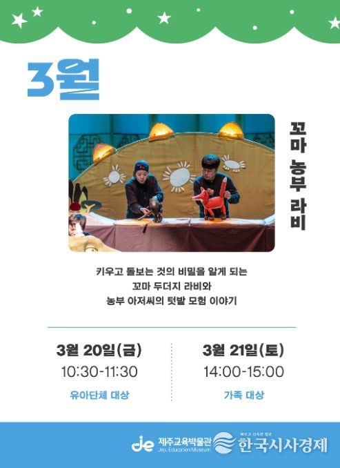 이달에는 유아 단체와 가족을 대상으로 춘분 절기를 주제로 한 어린이극 ‘꼬마 농부 라비’를 선보이며 공연은 20일과 21일 제주교육박물관에서 진행된다.
