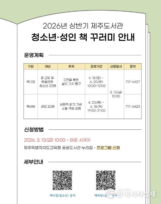 한국시사경제 노승선 기자 | 제주도교육청 제주도서관은 독서를 통한 사고력 신장과 소통 역량 강화를 지원하기 위해 ‘2026년 상반기 책 꾸러미’를 운영한다.