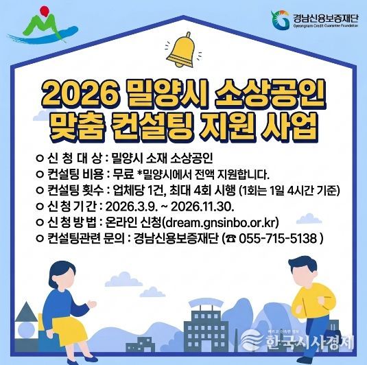 한국시사경제 노승선 기자 | 경남 밀양시는 관내 소상공인의 자생력을 높이고 경영 안정을 도모하기 위해 ‘2026년 소상공인 맞춤 컨설팅 지원사업’을 추진한다고 11일 밝혔다.