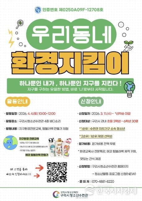 한국시사경제 경기북부취재본부 | 구리시청소년재단 청소년수련관은 관내 청소년들이 지구 환경의 소중함을 배우고 실천할 수 있는 ‘우리 동네 환경 지킴이’ 프로그램의 참가자를 오는 3월 11일부터 선착순으로 모집한다고 밝혔다.