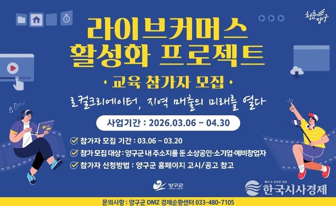 한국시사경제 경제팀 | 양구군은 지역 소상공인과 소기업, 예비창업자의 온라인 판매 역량 강화를 위해 ‘라이브커머스 활성화 프로젝트 교육’ 참가자를 모집한다.