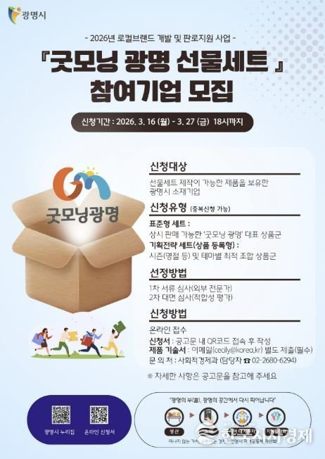 모집 대상은 선물세트 제작이 가능한 제품을 보유한 광명시 소재 중소기업, 사회적경제기업, 소상공인 등이다. 광명에서 생산·제조한 생활용품, 식품, 공예품 등 특판이 가능한 전 품목이 해당하며, 선정된 제품은 ‘굿모닝광명’ 브랜드 로고와 전용 패키지를 입혀 세련된 세트 상품으로 재탄생한다.