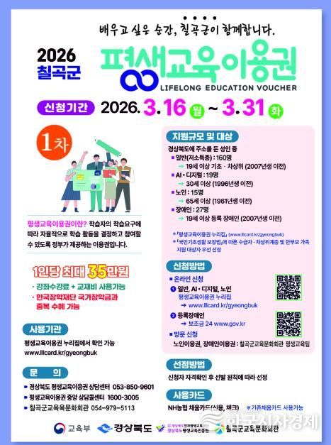 한국시사경제 노승선 기자 | 칠곡군은 저소득층, 노인, 장애인 등 교육 소외계층 221명을 대상으로 ‘2026년 평생교육이용권’ 지원사업을 추진한다.