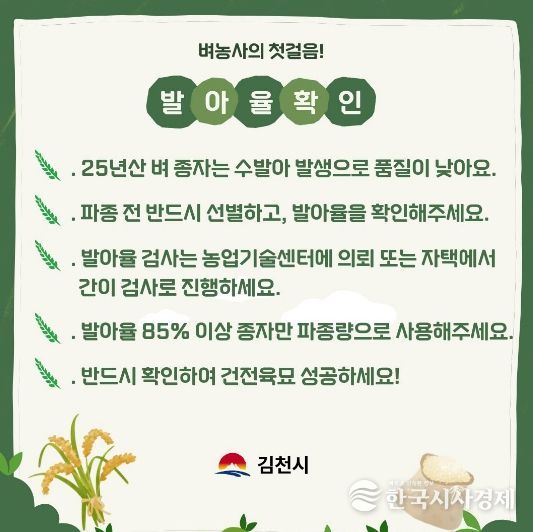 한국시사경제 의료보건팀 | 김천시는 작년 가을철 잦은 강우로 인해 벼 이삭에서 종자가 발아하는 수발아 현상이 다수 발생함에 따라, 농업기술센터에서 자가채종 벼 종자의 발아율 검사를 추진하고 있다고 밝혔다.
