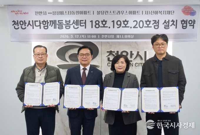 한국시사경제 문화팀 | 천안시는 12일 시청 제1소회의실에서 성성비스타동원·불당린스트라우스 아파트 입주자대표회의, 사회복지법인 신아복지재단과 ‘다함께돌봄센터 18·19·20호점 설치장소 제공’을 위한 협약을 각각 체결했다.