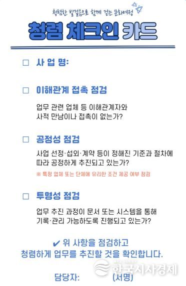 체크인 카드에는 ▲이해관계자와의 사적 접촉 여부 ▲사업 추진 과정의 공정성 ▲부당청탁 발생 여부 ▲업무 추진 과정의 기록 및 관리 가능 여부 등 업무 추진 시 점검해야 할 청렴 항목이 포함돼 있으며, 담당자가 업무 시작 단계에서 간단히 확인하도록 구성됐다. 특히 문화관광 분야는 민간단체 및 업체와의 협업이 많은 만큼, 이번 시책을 통해 업무 초기 단계에서 청렴 위험 요소를 점검함으로써 부패 발생 가능성을 사전에 예방하는 데 목적이 있다.