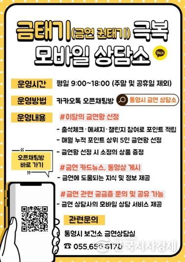 한국시사경제 의료보건팀 | 통영시는 금연 시도자들이 겪는 이른바 ‘금태기(금연 권태기)’를 효과적으로 극복할 수 있도록 돕는 ‘모바일 금연 상담소’를 올해 확대 운영한다고 12일 밝혔다.
