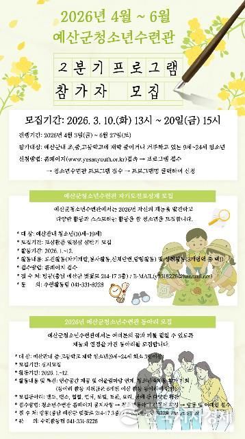 한국시사경제 충남취재본부 | 예산군청소년복지재단 소속 예산군청소년수련관은 관내 청소년의 건강한 성장 지원과 자기주도적 역량 강화를 위해 2026년 2분기 청소년 프로그램 참가자를 모집한다고 밝혔다.