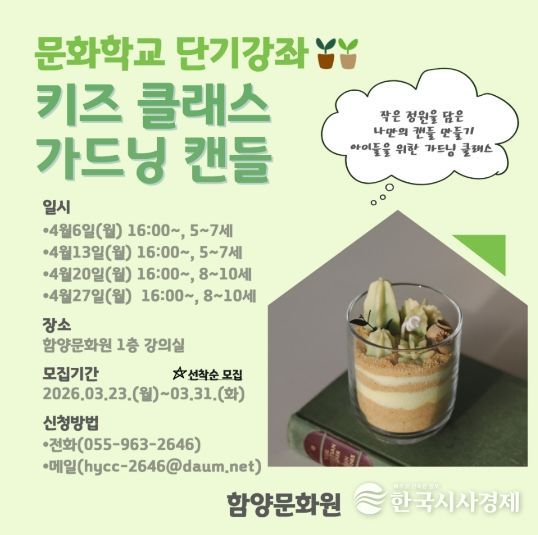 한국시사경제 김숙영 기자 | 함양문화원(원장 정상기)은 군민들에게 문화예술 체험 기회를 제공하기 위해 오는 4월 단기강좌 '글라스아트 클래스'와 '키즈 캔들 클래스'를 운영한다.