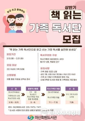 한국시사경제 노승선 기자 | 창원시 마산회원도서관은 가족 독서문화 확산을 위해 ‘책 읽는 가족 독서단’을 운영하고 3월 10일 부터 3월 31일까지 상반기 참여 가족을 모집한다.