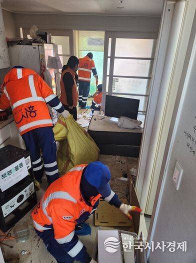 한국시사경제 경기취재본부 | 시흥시 장곡동은 지난 3월 12일 LH19단지에서 집안의 오물과 쓰레기 적치로 주변 가구까지 피해를 주고 있는 주거환경 취약가구에 명성환경(자)과 함께 주거 환경 개선 사업을 실시했다.