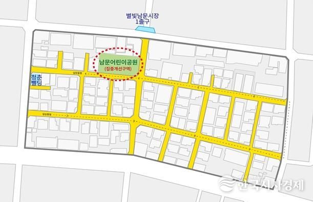 특히 대상지 중심에 위치한 남문어린이공원은 폐쇄적인 휴게공간과 급경사 계단 등의 환경 여건으로 이용이 불편하고 별빛남문시장이 인접해 음주‧주취 등으로 인한 주민 불안감이 높은 취약지다.