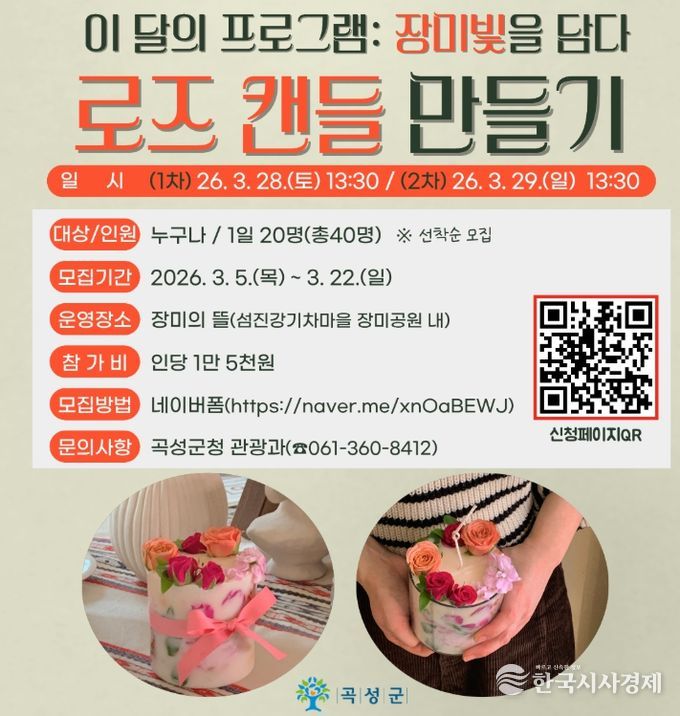 한국시사경제 권충언 기자 | 전남 곡성군은 ‘장밋빛을 담다’를 주제로 한 로즈캔들 만들기 체험 프로그램을 오는 3월 28일부터 29일까지 이틀간 운영한다고 밝혔다.