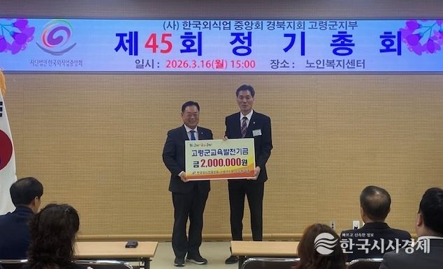 한국시사경제 노승선 기자 | 3월 16일 고령군 노인복지센터 강당에서 개최된 ‘사)한국외식업중앙회 경북지회 고령군지부 제45회 정기총회’에서 고령군지부 임직원은 지역의 교육 발전과 인재 양성을 위해 사용해 달라며 교육발전기금 200만원을 기탁했다.