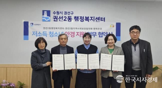 한국시사경제 사회팀 | 수원시 권선구 권선2동은 지난 13일 권선2동 지역사회보장협의체, 한독안경과 ‘저소득 청소년 안경 지원사업’ 업무협약을 체결했다고 밝혔다.