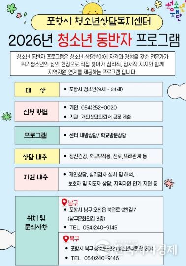 한국시사경제 문화팀 | 포항시청소년재단 청소년상담복지센터는 고위기 청소년을 대상으로 생활 현장을 직접 찾아가 지원하는 ‘2026년 청소년동반자 프로그램’을 연중 운영한다.