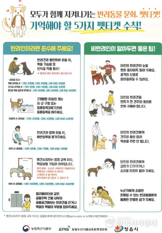 한국시사경제 전북취재본부 | 정읍시가 봄철 나들이 시즌을 맞아 반려인과 비반려인 간의 갈등을 예방하고 성숙한 반려동물 문화를 조성하기 위해 23개 읍·면·동 전역에 ‘펫티켓’ 홍보물 배부에 나선다.
