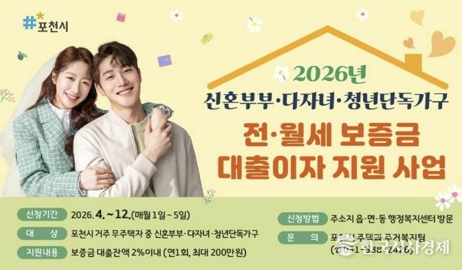한국시사경제 경기북부취재본부 | 포천시는 ‘2026년 신혼부부·다자녀·청년가구 전월세 보증금 대출이자 지원사업’을 추진한다.