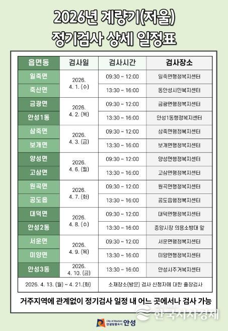 정기검사는 4월 1일부터 10일까지 읍·면·동 순회검사 방식으로 진행되며 검사 장소는 각 행정복지센터를 비롯해 안성시 주거복지센터와 안성중앙시장 등이다.