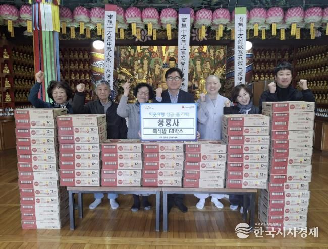 한국시사경제 경기북부취재본부 | 가평 청룡사는 최근 지역의 소외된 이웃들에게 도움이 되길 바라는 마음으로 청평면 행정복지센터에 즉석밥 60박스를 기탁했다.
