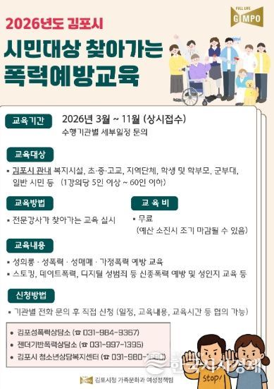한국시사경제 경기북부취재본부 | 김포시는 시민의 건전한 성 가치관 형성과 폭력 예방 의식 확산을 위해 ‘2026년 김포시 시민대상 폭력예방교육’ 사업을 3월부터 11월까지 추진한다고 밝혔다.