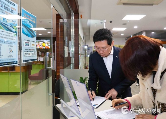 한국시사경제 사회팀 | 이상일 용인특례시장은 18일 오전 수지구 성복동행정복지센터를 찾아 경기남부광역철도 등 철도망 구축을 위한 서명운동에 참여했다.