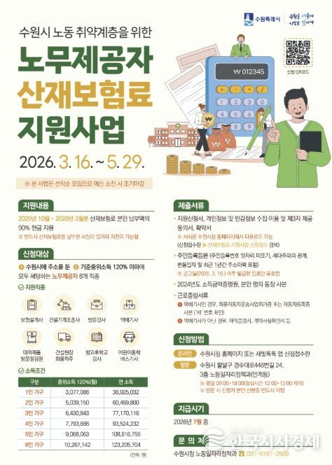 한국시사경제 사회팀 | 수원특례시는 5월 29일까지 ‘2026년 상반기 노동 취약계층 노무제공자 산재보험료 지원사업’ 신청을 받는다.