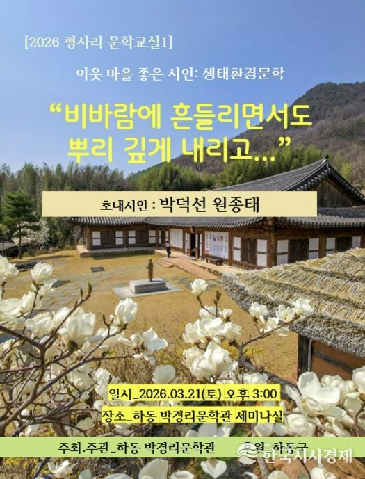 한국시사경제 경남취재본부 | 하동 박경리문학관이 오는 3월 21일 오후 3시, 문학관 내 세미나실에서 ‘2026 평사리문학교실1 : 이웃 마을 좋은 시인-생태환경문학’ 강연을 개최한다.