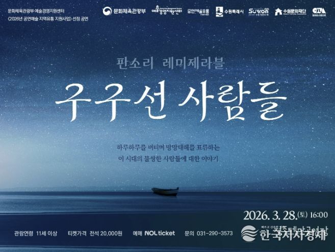 수원문화재단은 정조테마공연장에서 오는 28일 오후 4시, 문화체육관광부와 예술경영지원센터의 ‘2026 공연예술 지역유통 지원사업’ 선정작인 ‘판소리 레미제라블 '구구선 사람들'’을 선보인다.