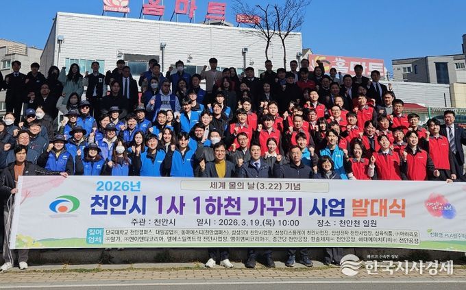 한국시사경제 사회팀 | 천안시는 세계 물의 날(3월 22일)을 기념해 19일 천안천 일원에서 ‘2026년 1사 1하천 가꾸기 사업’ 발대식을 개최하고 하천 정화활동을 진행했다.