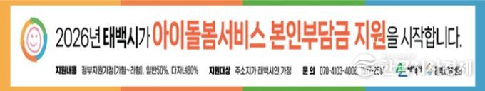 아이돌봄서비스는 맞벌이·다자녀 가정 등 돌봄 공백이 발생한 가정의 만 12세 이하 아동을 대상으로 아이돌보미가 직접 방문해 돌봄을 제공하는 서비스다. 태백시는 정부지원금 외 본인부담금의 50%에서 최대 80%까지 지원한다.