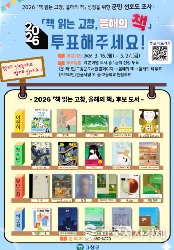 한국시사경제 김숙영 기자 | 고창군도서관이 오는 27일까지 2026 ‘책 읽는 고창, 올해의 책’ 선정을 위한 군민 선호도 조사를 실시한다고 20일 밝혔다.