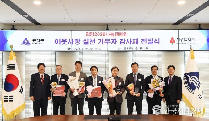 한국시사경제 부산취재본부 | 부산 동래구는 지난 19일 부산사회복지공동모금회(회장 이수태) 주관으로 희망 2026 나눔 캠페인 이웃사랑 실천 기부자 감사패 전달식을 개최하고, 지역사회 나눔 문화 확산에 기여한 기부자들에게 감사의 뜻을 전했다고 밝혔다.