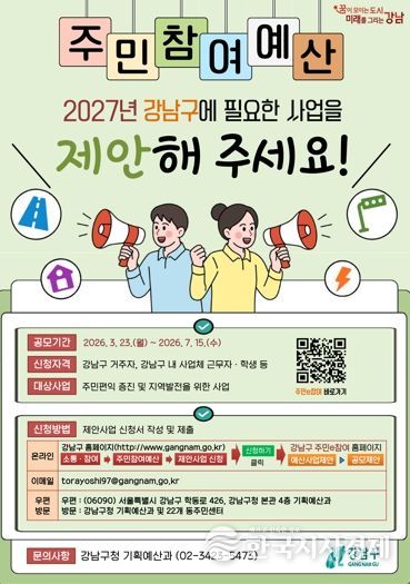 한국시사경제 이정이 기자 | 꿈이 모이는 도시, 미래를 그리는 강남구가 2027년도 예산편성에 반영할 주민참여예산 제안사업 공모를 3월 23일부터 7월 15일까지 진행한다. 올해 공모 규모는 총 13억 원으로, 주민이 직접 생활 속 불편을 해결하고 지역에 필요한 사업을 제안해 예산에 반영하는 참여형 제도다.