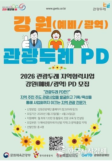 한국시사경제 권충언 기자 | 강원특별자치도와 강원관광재단은 지역관광 활성화를 위한 '2026 관광두레 지역협력사업'의 일환으로 ‘강원 PD(예비·광역)’를 공개 모집한다고 밝혔다.