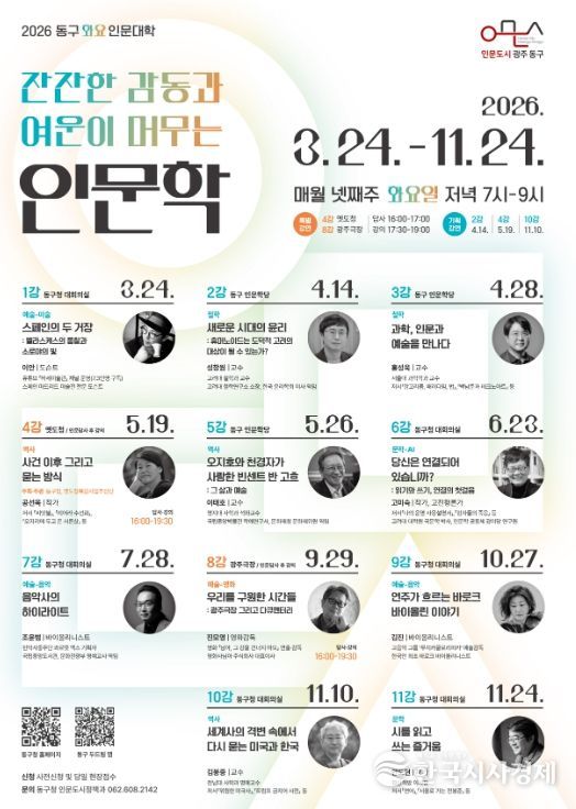 한국시사경제 광주취재본부 | 광주 동구는 ‘잔잔한 감동과 여운이 머무는 인문학’을 주제로 예술, 철학, 역사, 문학 등 각 분야의 명망 있는 강사들을 초청해 진행하는 ‘동구 화요 인문대학’을 24일 개강한다고 밝혔다.