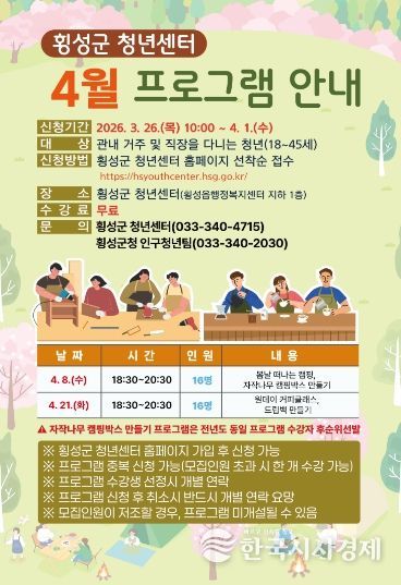 한국시사경제 권충언 기자 | 횡성군 청소년 성년기 이행과 청년들의 건강한 성장을 지원하는 횡성군 청년센터가 오는 26일부터 ‘4월 프로그램’ 수강생을 모집한다.